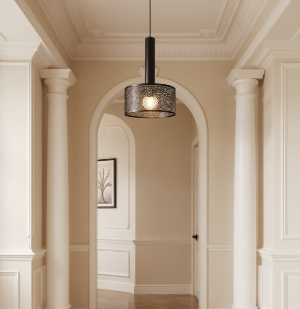 $467.00 – $700.00Price range: $467.00 through $700.0010" x 15" (25.40 x 38.1 cm)12" x 18" (30.48 x 45.7 cm)14" x 21" (35.56 x 53.3 cm)ClearModern tubular pendant featuring handcrafted cylindrical shade and elongated stem. Available in multiple metal finishes, combining contemporary design with traditional Moroccan metalwork, completed over 40-120 hours. Key Features: Cylindrical pierced shade Extended tubular stem Minimalist ceiling mount Contemporary silhouette Room Applications: Bedside Lighting: Creates paired ambient lighting Reading Areas: Provides […]