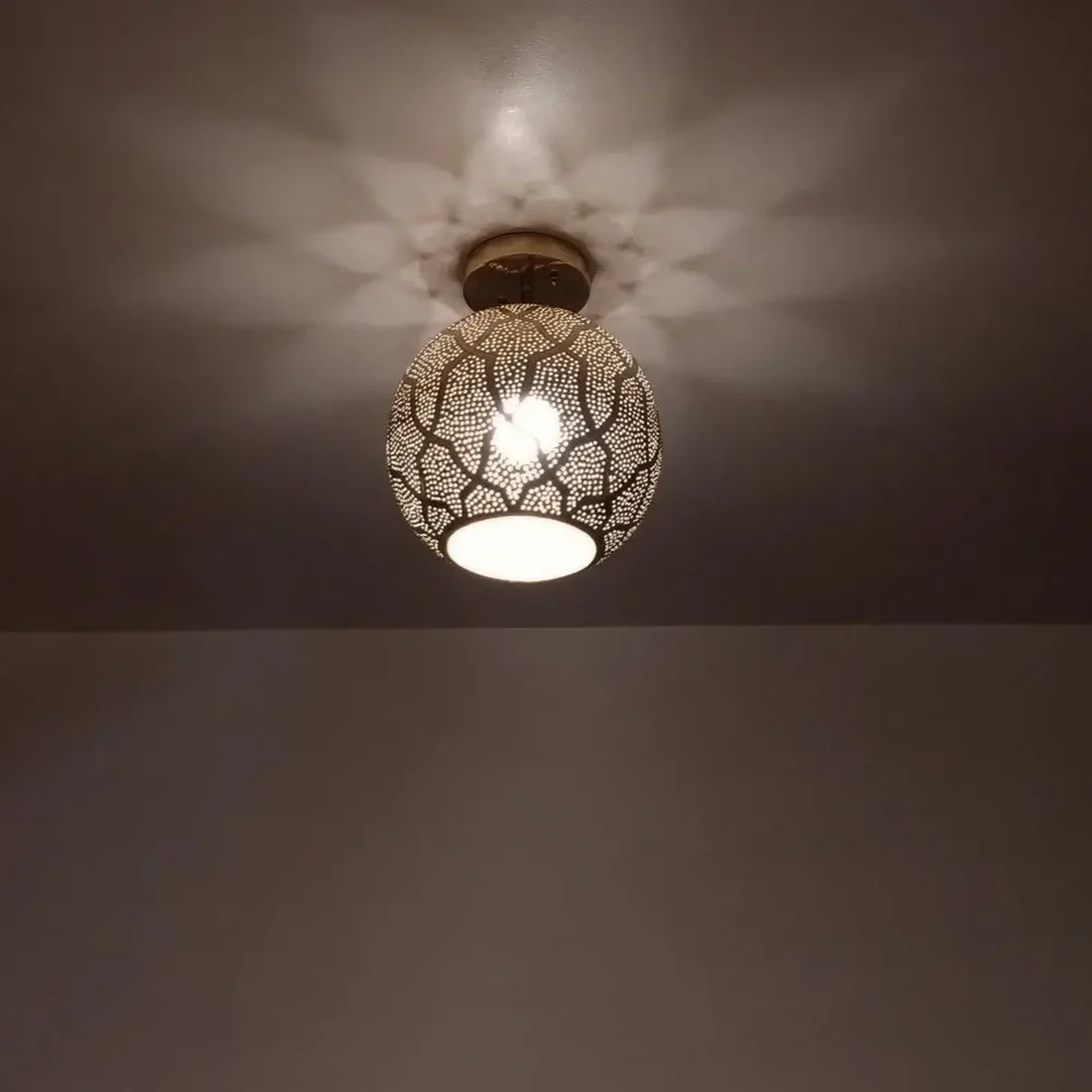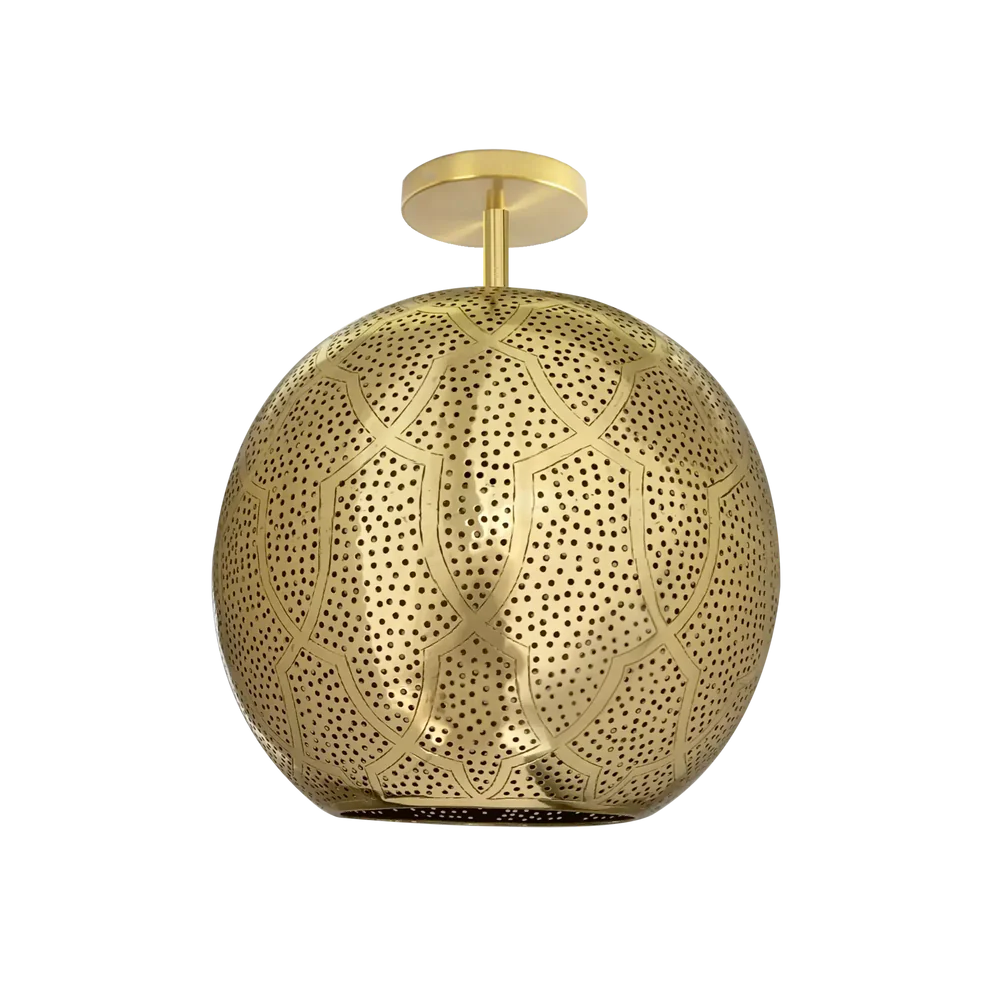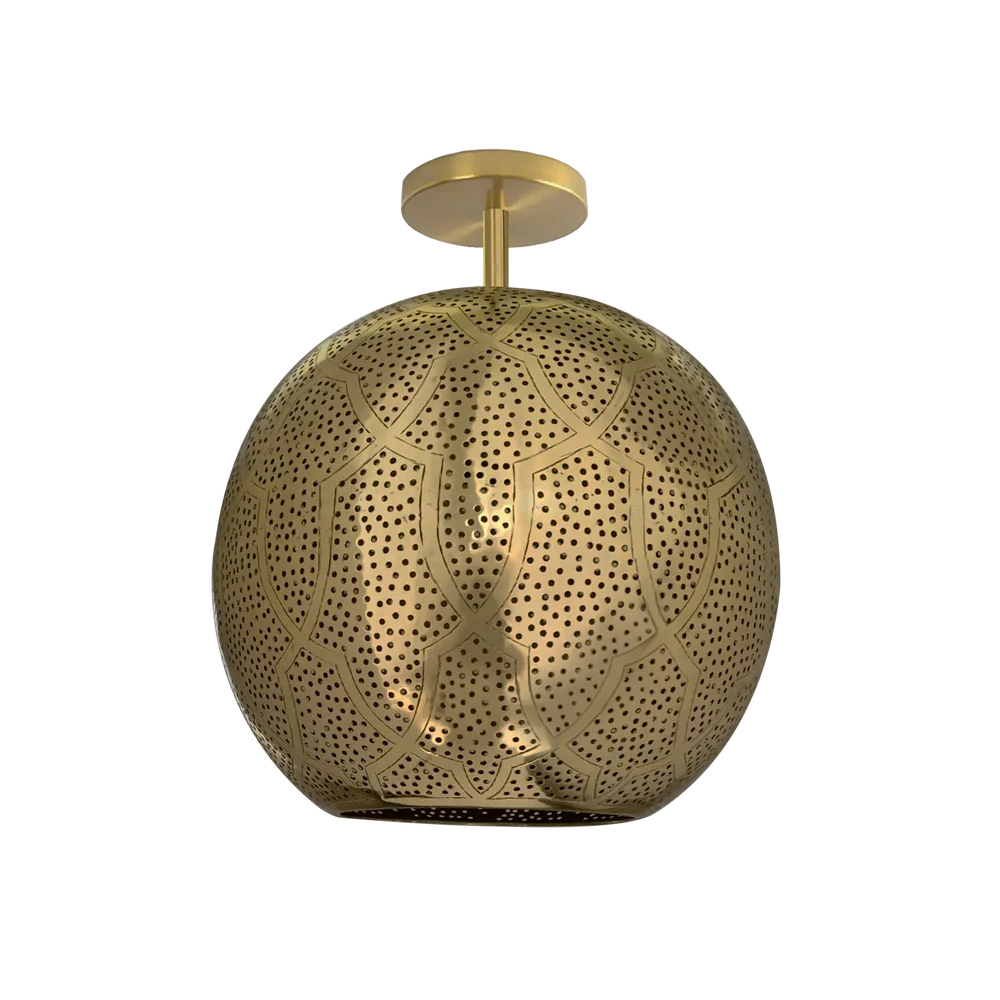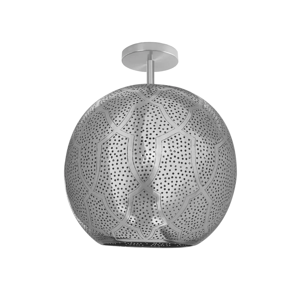 A sophisticated semi-flush mount light featuring traditional Moroccan Darj W Ktef patterns on a modern spherical shade. This artisanal piece combines centuries-old craftsmanship with contemporary design to create an elegant lighting fixture.