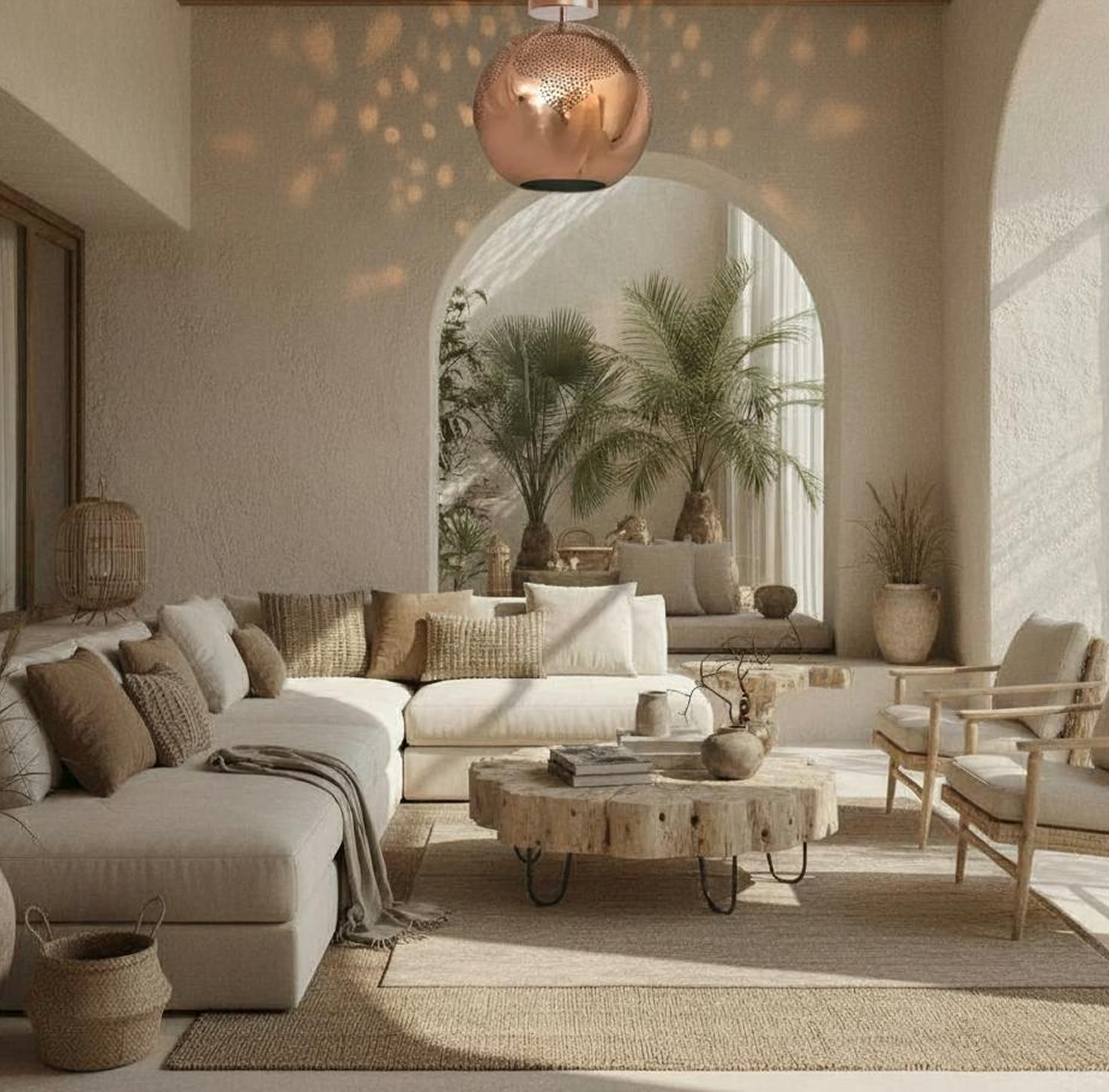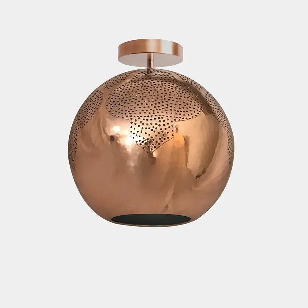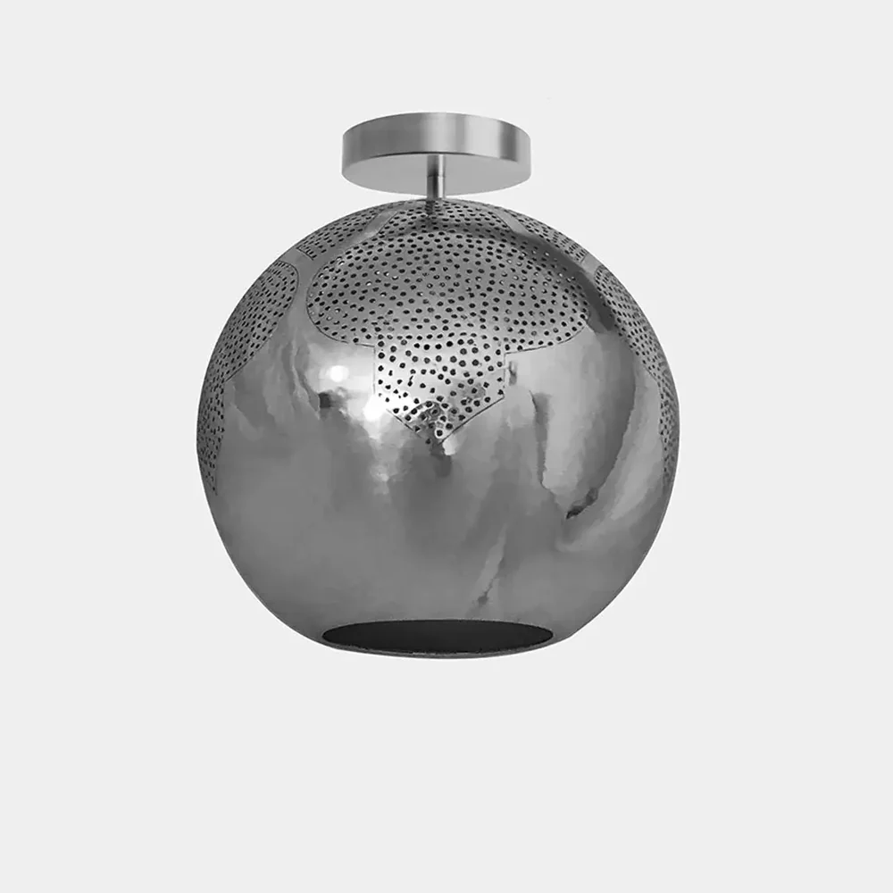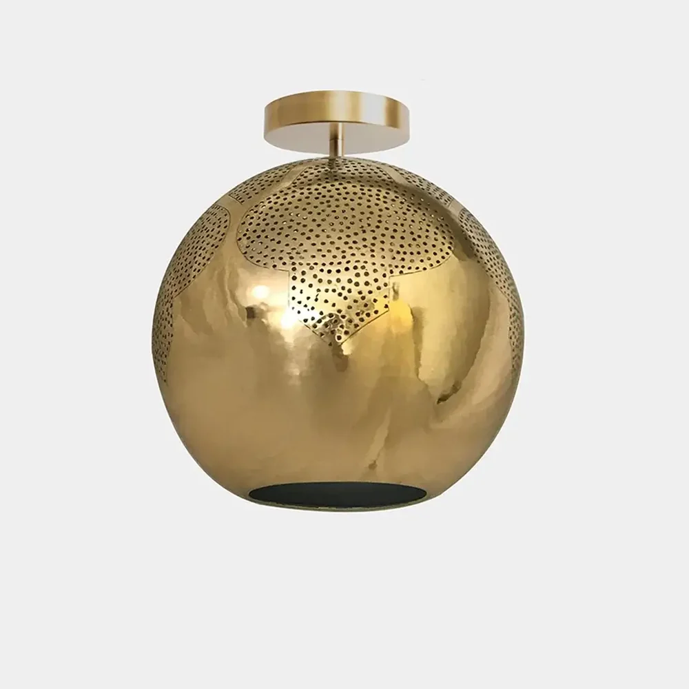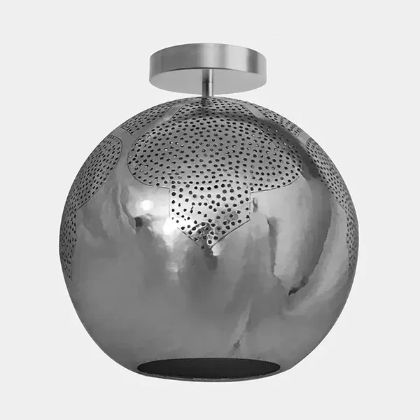 The HUSN Semi-Flush Mount Light features a modern spherical shade with intricate perforated patterns. This Moroccan-inspired ceiling fixture combines sleek metalwork with traditional craftsmanship, creating both functional lighting and artistic shadow patterns.