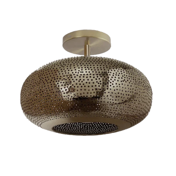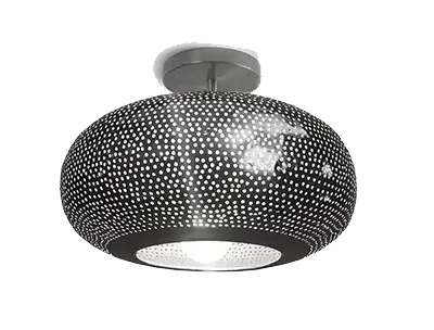 Modern Moroccan ceiling light featuring intricate pierced metalwork in a spherical design. Handcrafted in Marrakech from pure metals. Creates ambient lighting through decorative shadow patterns.