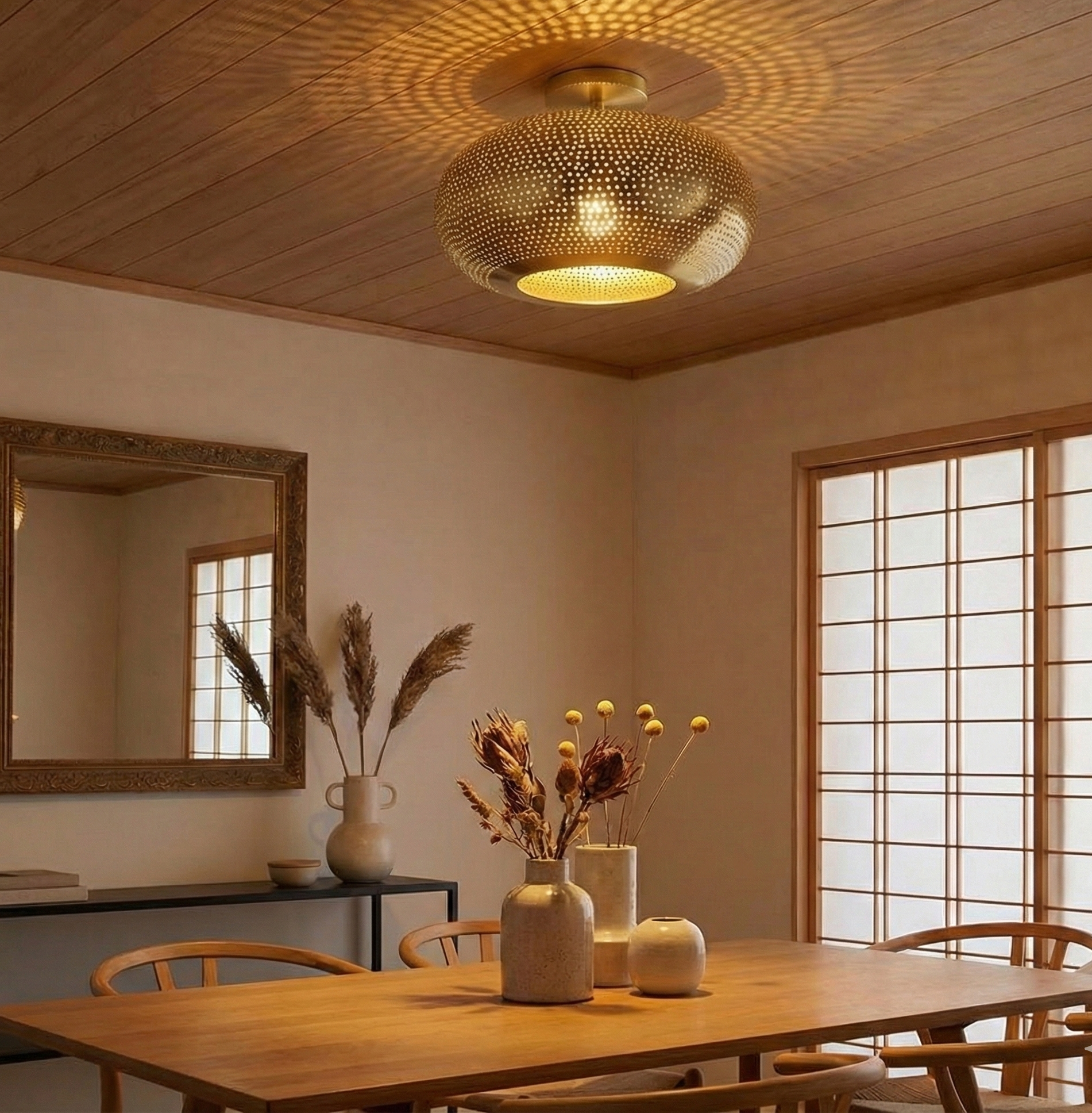 - Pierced metalwork creates patterned light display