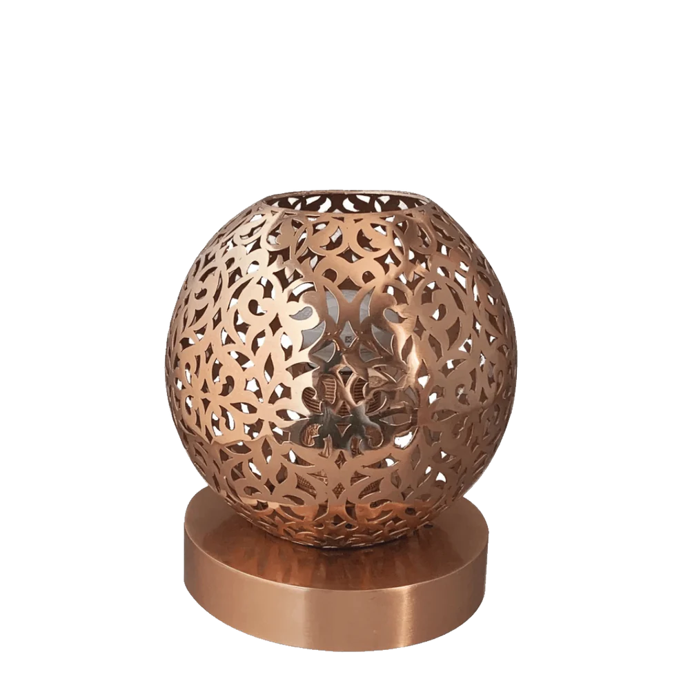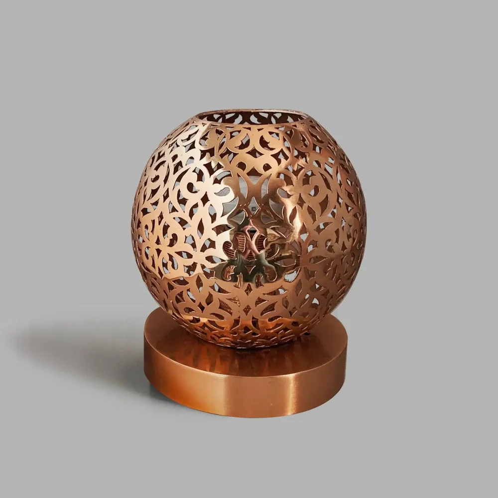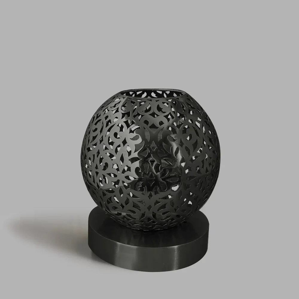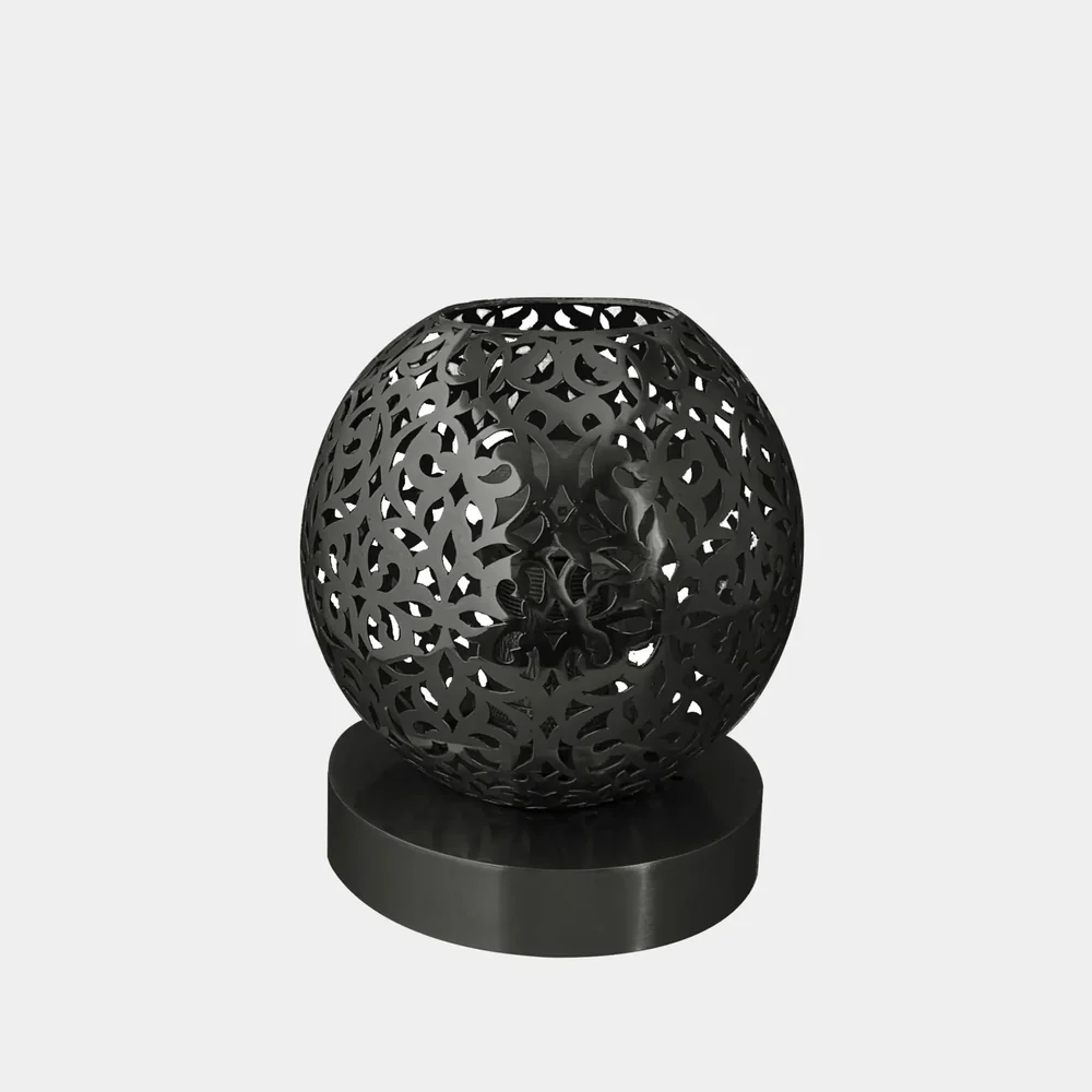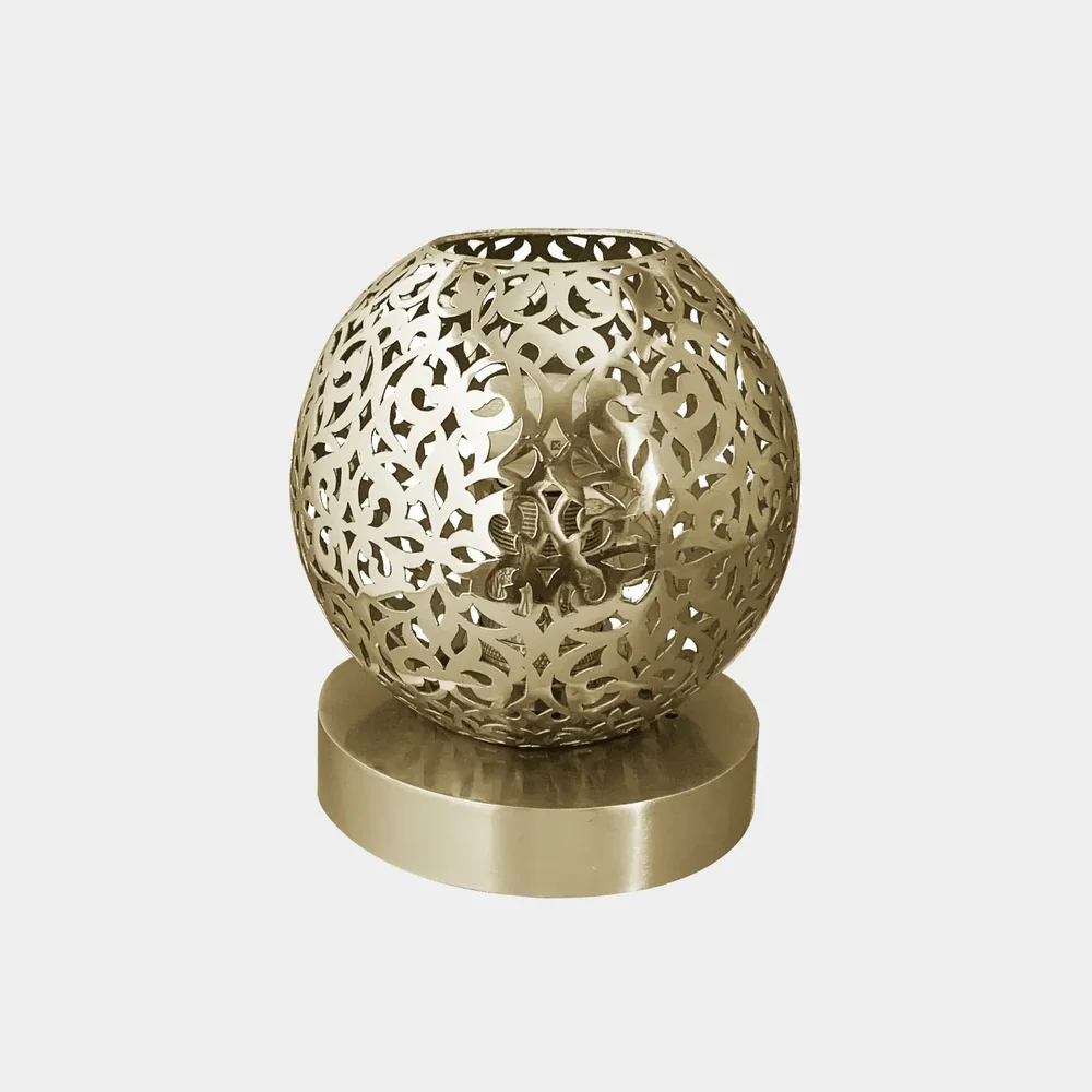 Modern interpretation of traditional Moroccan table lamp featuring a spherical filigree shade on a substantial brass base. Handcrafted from precious metals over 30-50 hours, combining intricate metalwork with contemporary design.