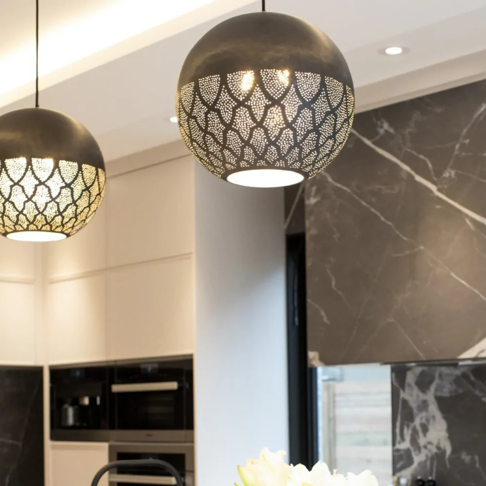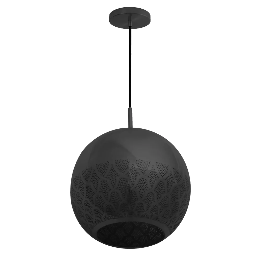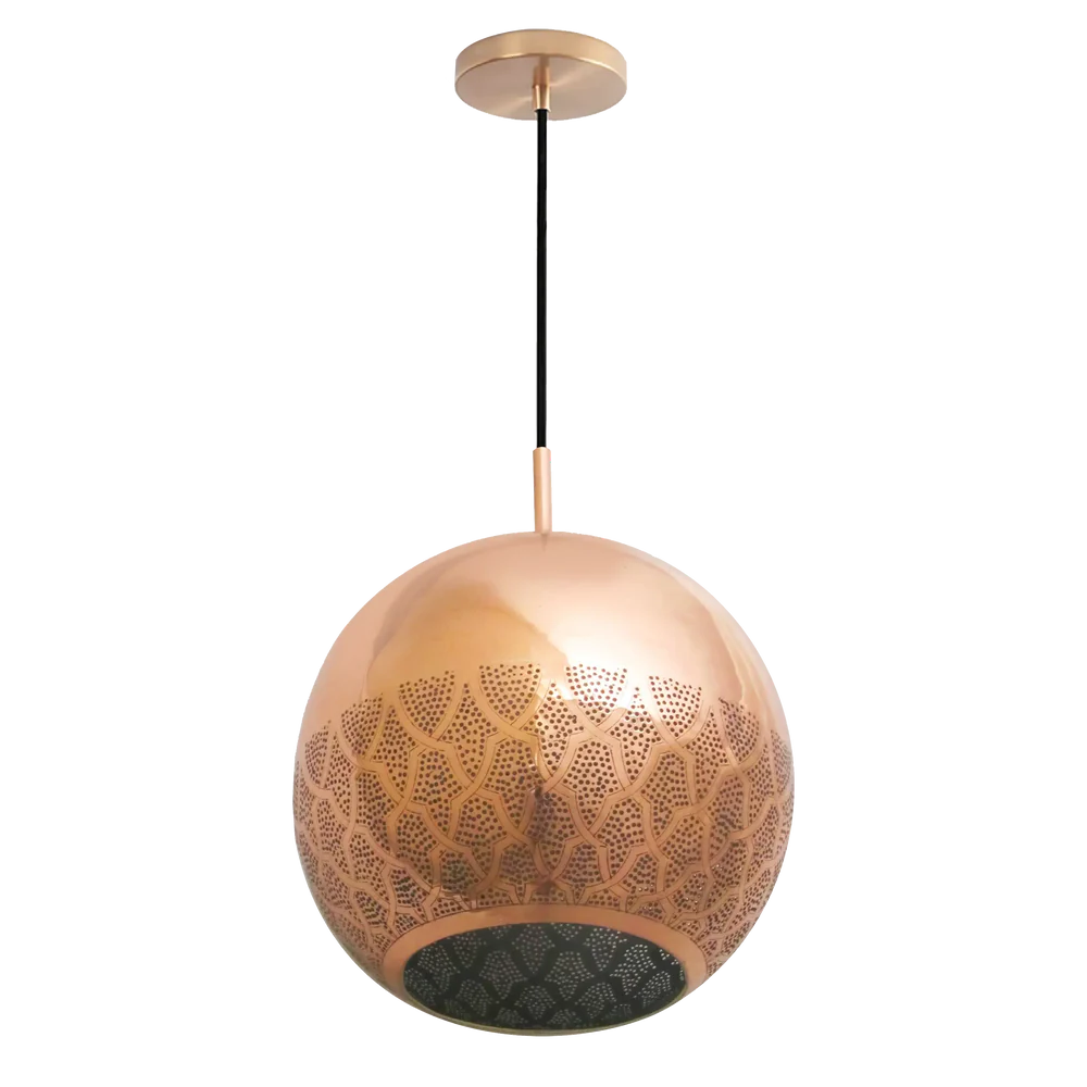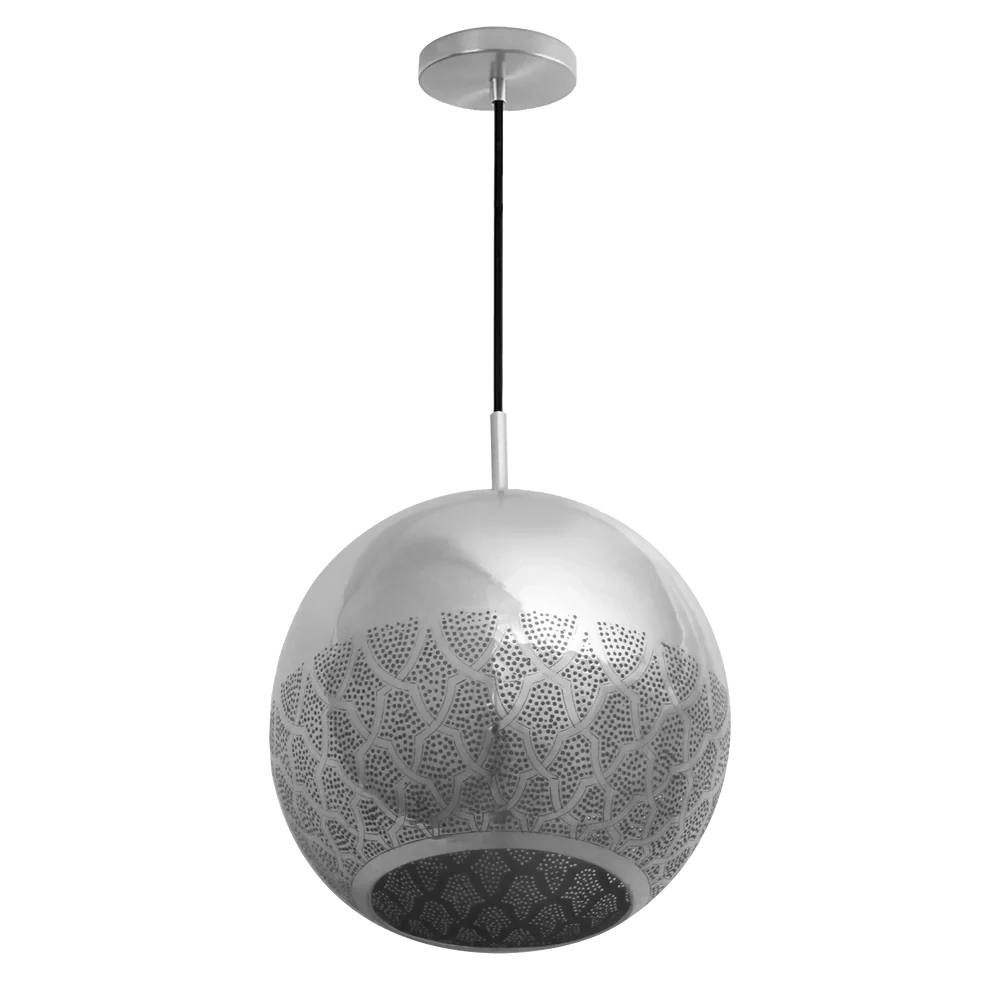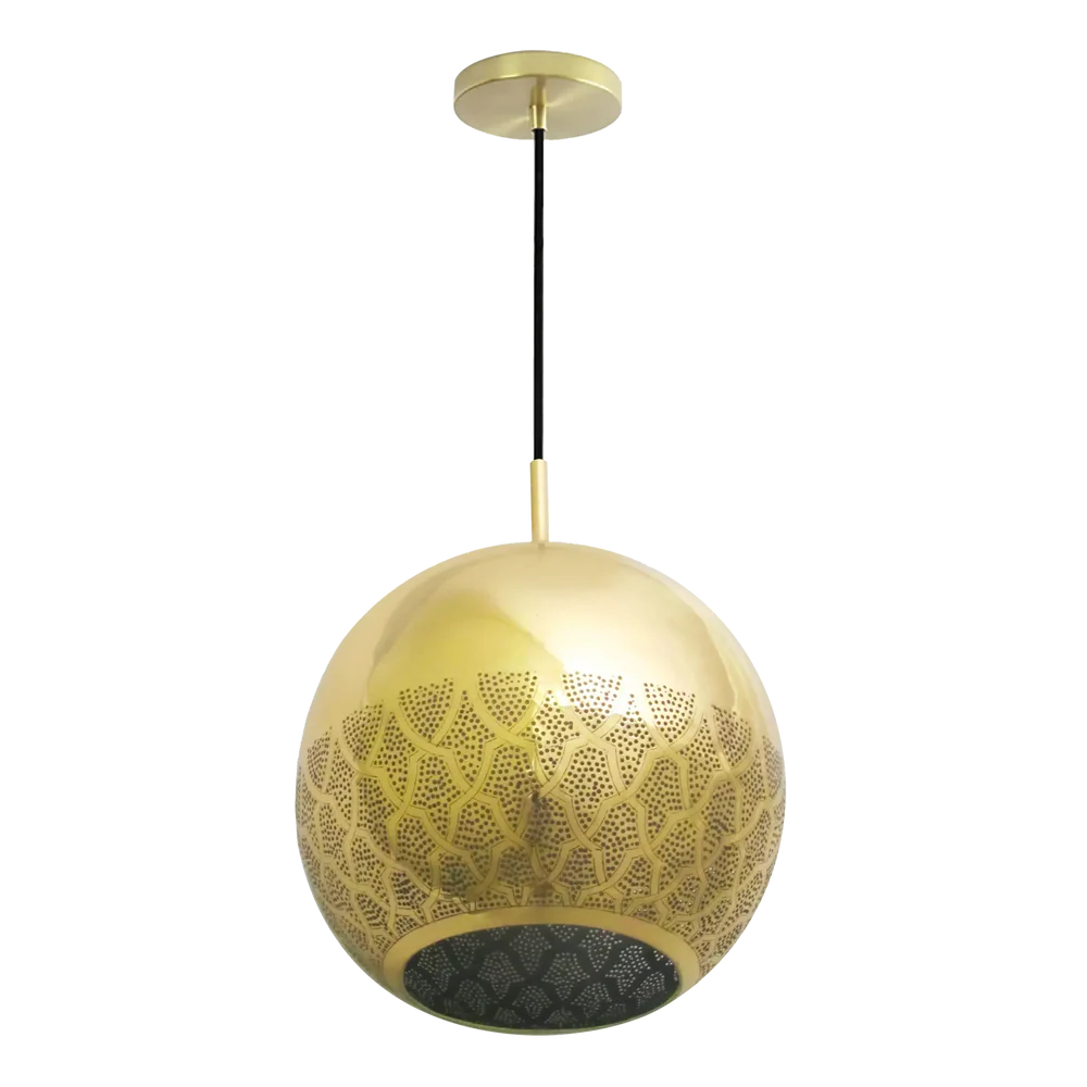 Historically-inspired Moroccan pendant featuring reversed filigree pattern based on Darj W Ktef design from the Almohad dynasty. Hand-crafted over 40-120 hours with dual-direction lighting effect.