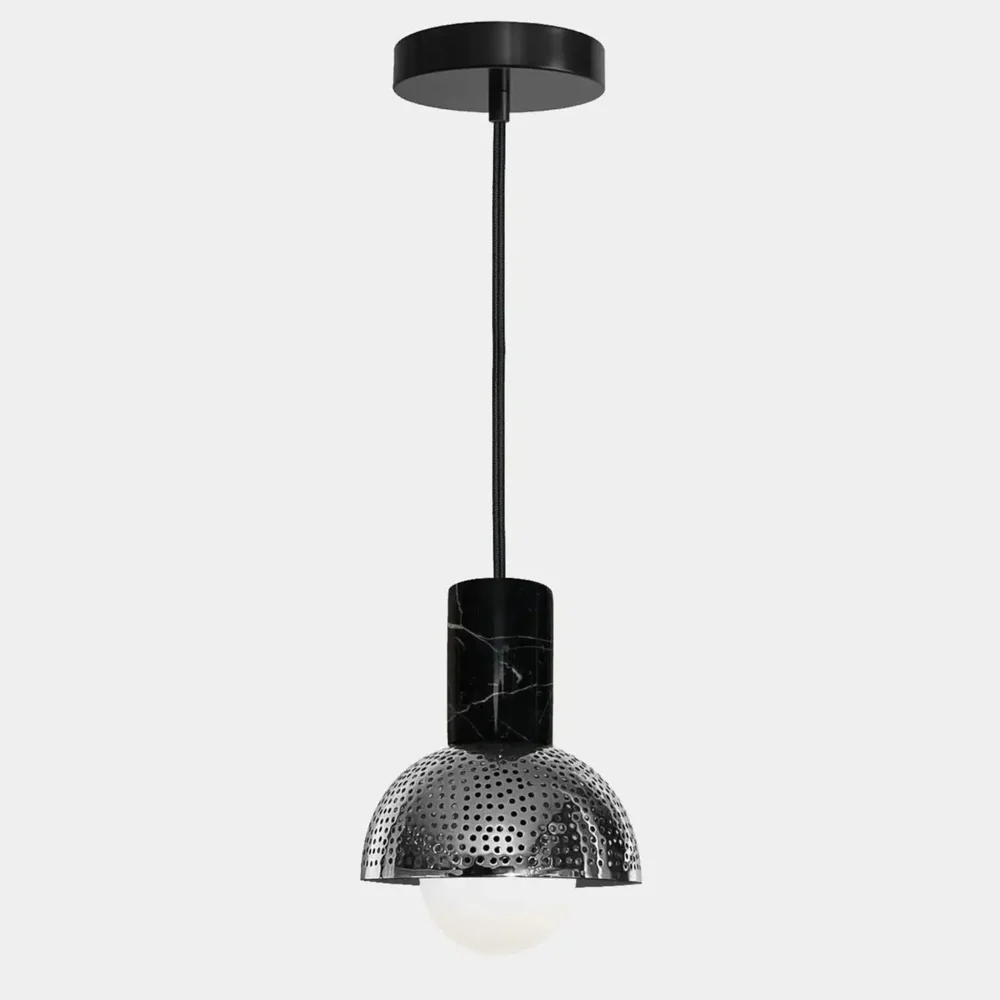Modern pendant featuring perforated metal dome shade with black marble stem detail. Combines minimalist design with Moroccan metalwork, handcrafted over 40-120 hours.