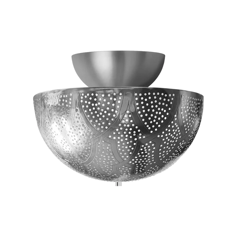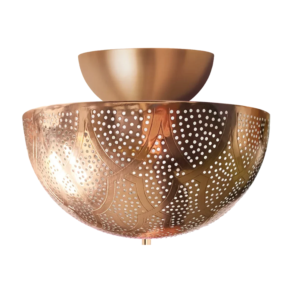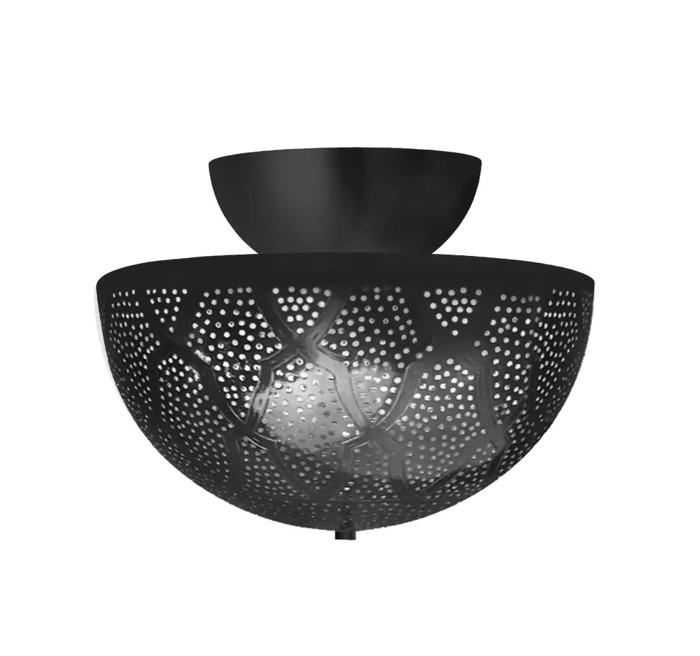 A contemporary flush mount ceiling light featuring traditional Moroccan pierced patterns in an elegant half-dome design. This versatile fixture merges mid-century aesthetics with artisanal craftsmanship to create dramatic ambient lighting.