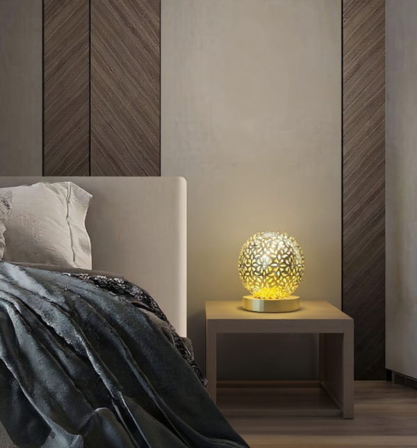 $428.0010" x 10" x 3" (25.40 x 25.4 x 7.62 cm)ClearHandcrafted Moroccan table lamp featuring modern filigree patterns in pure metals. Creates artistic shadow displays while providing functional lighting. Production time: 30-50 hours per piece. Key Features: Disc-shaped filigree design Modern pattern interpretation Shadow-casting capability Handcrafted metalwork Room Applications: Living Room: Creates intimate corner lighting Bedroom: Perfect for nightstand ambiance […]